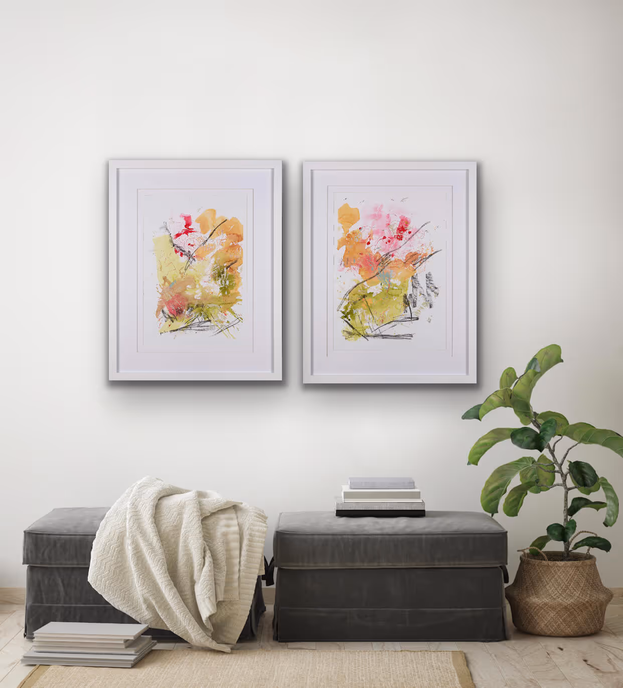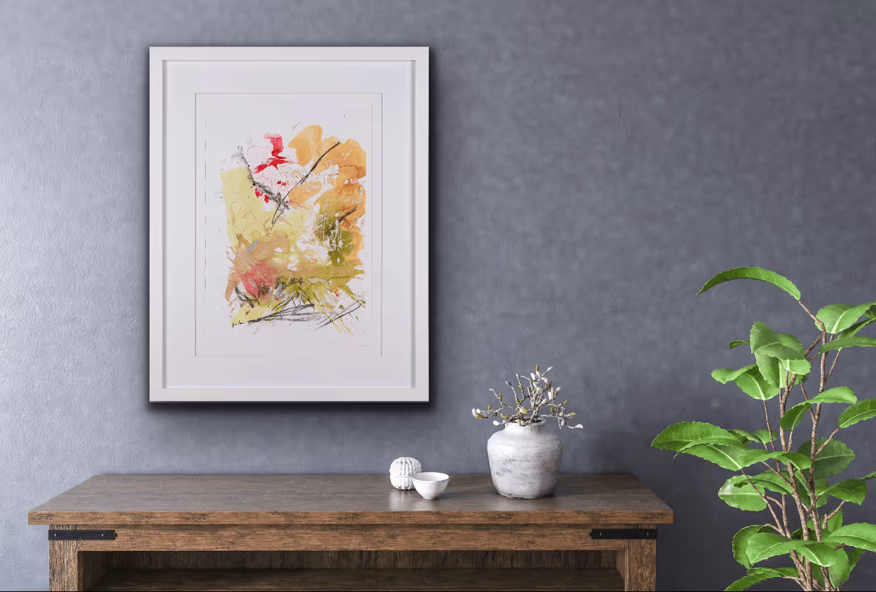 Part of a series of paintings inspired by special places. Enthralled by the gentle beauty of the countryside beginning to awaken in the early spring. The busy sound of life returning and the air humming with the sounds and scents of nature and the abundance of spring. This painting, full of joy and expectation is created with bold, spontaneous paint and mixed media marks.