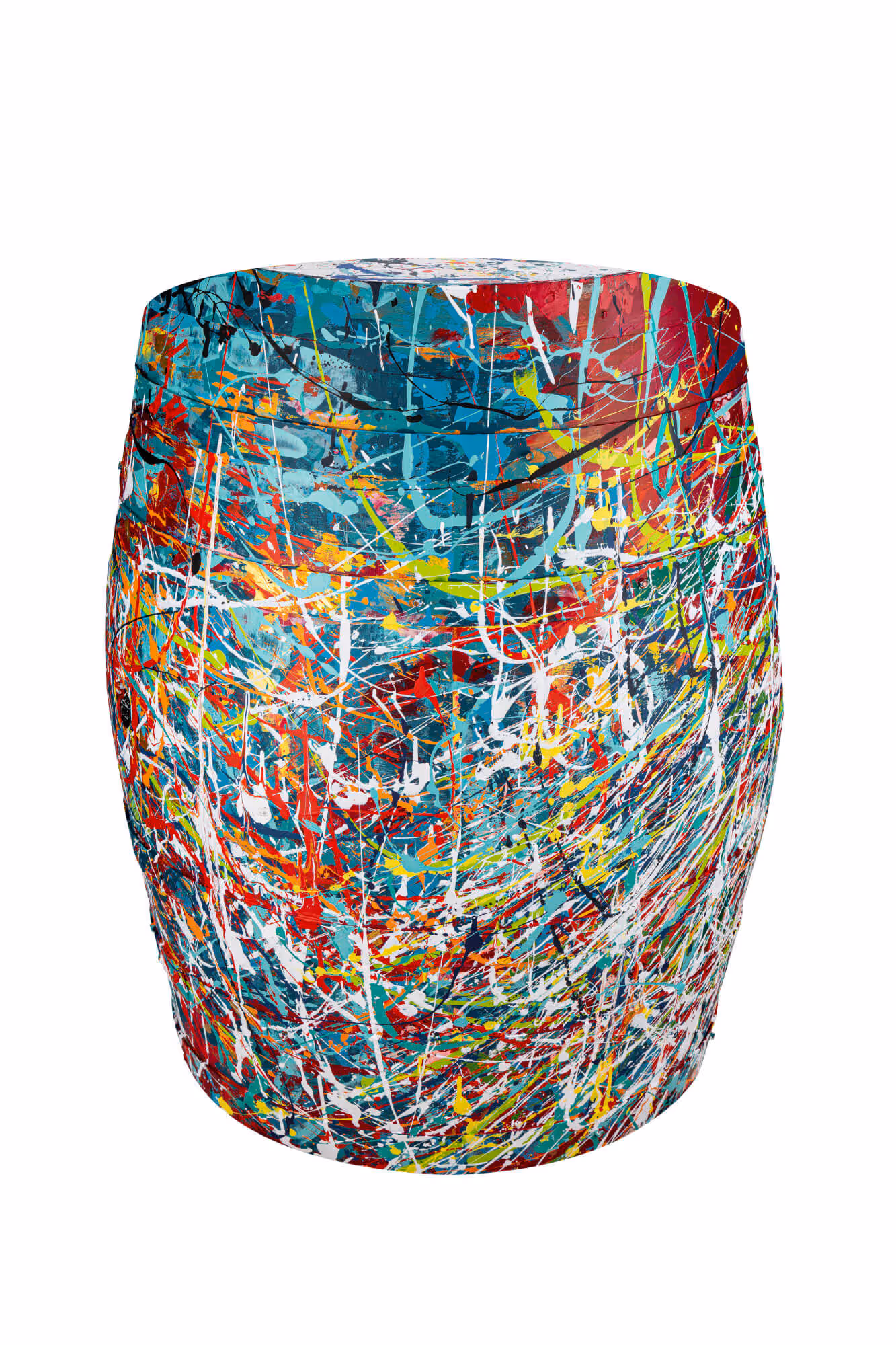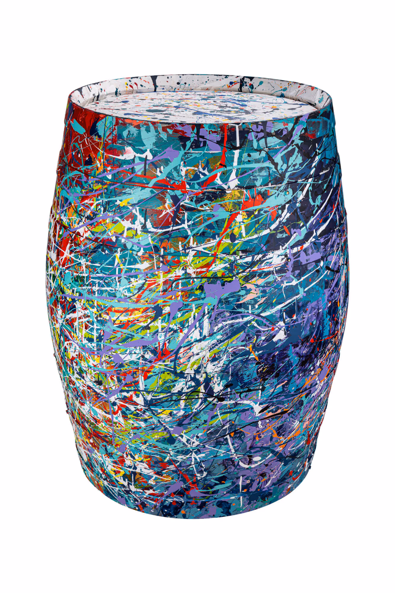 Created with vibrant layers of colour, each barrel gives a unique 360-degree canvas with many perspectives and views to brighten a space. They have been placed in private homes, restaurant and entertainment areas to be viewed aesthetically as well as offering functionality as a sideboard or tabletop space. Clients have made their own adaptations to the painted barrels according to their needs, adding glass tops and wheels to maximize functionality as well as ensuring that the 360-degree painting can be viewed from all its many angles. A beautiful and unique artwork that makes a big statement in any space. Available by commission. Contact me if you would like to own your own unique painted wine barrel.