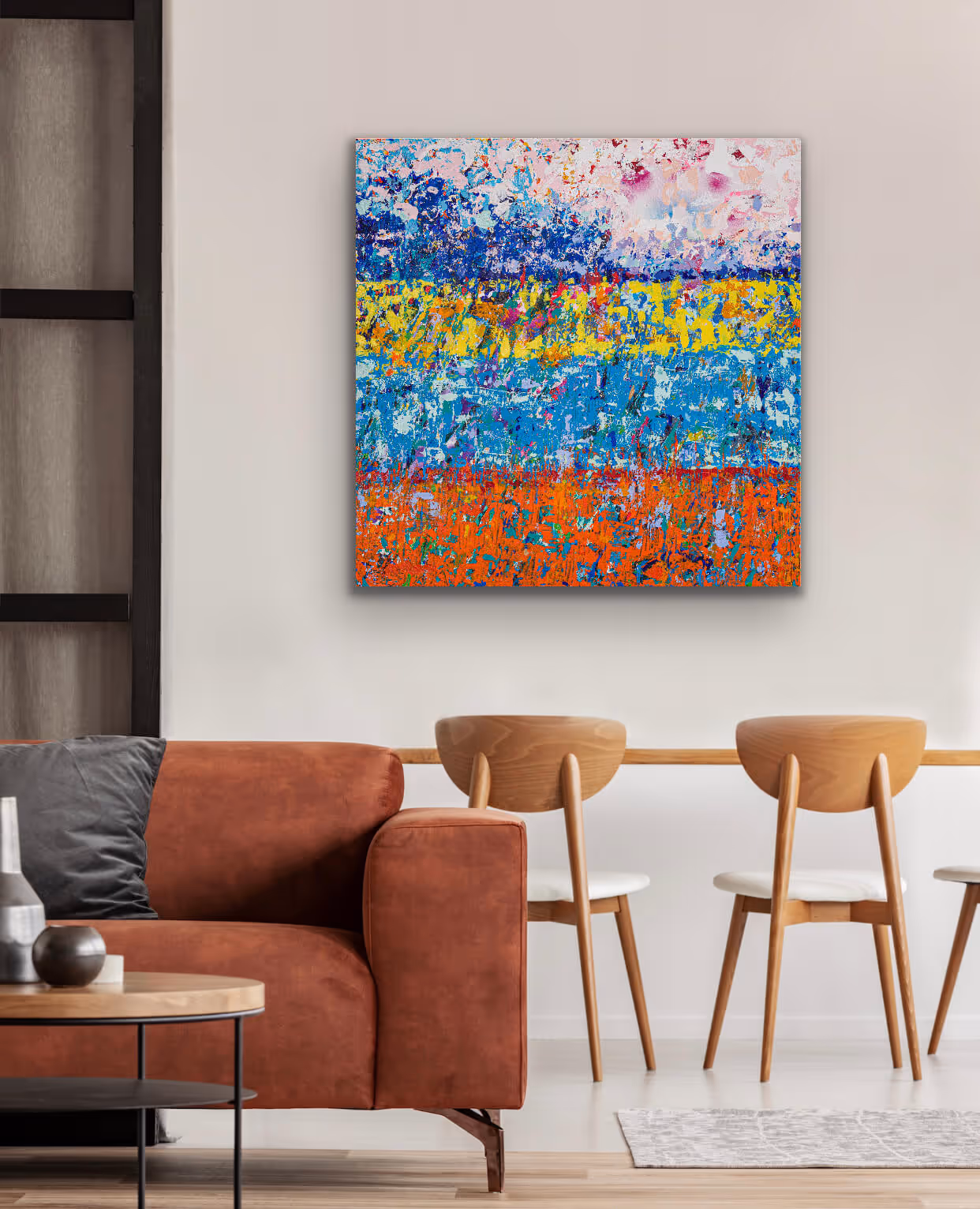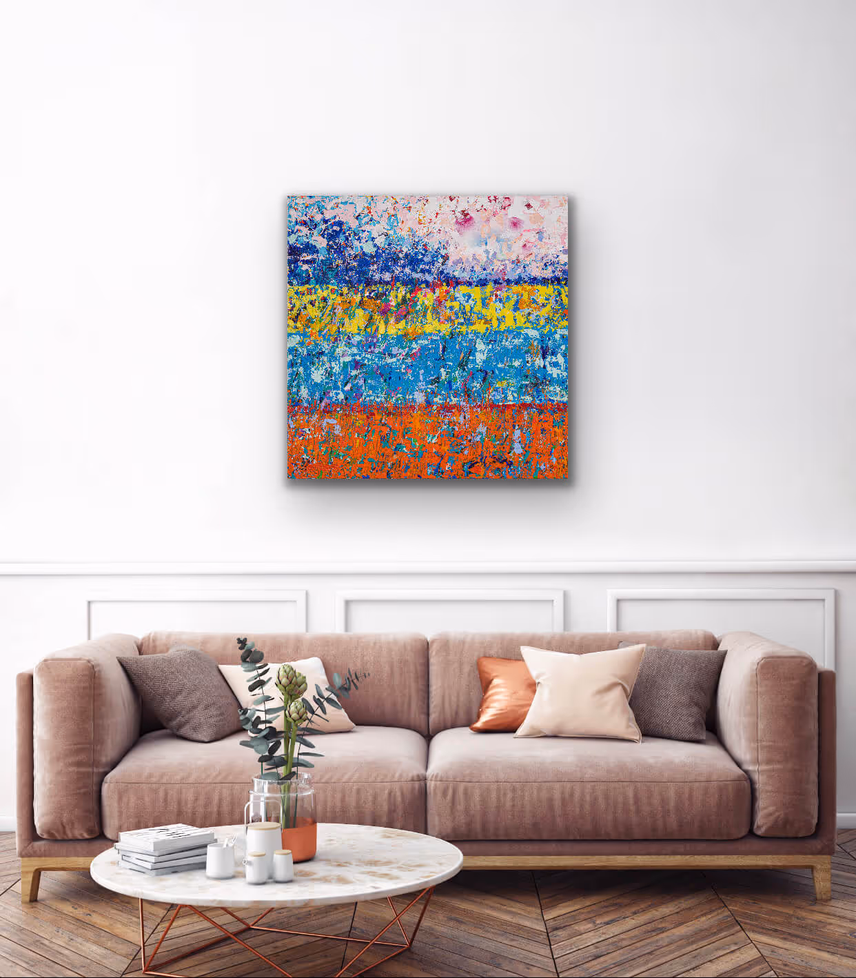 Inspired by the notion of perspectives and windows that frame our view. This painting is full of surprises and colour, the lightness and brightness of the colour combinations and the teasing glints of what lies underneath are enough to make sure that it is a painting that will always deliver, there is always more to discover.