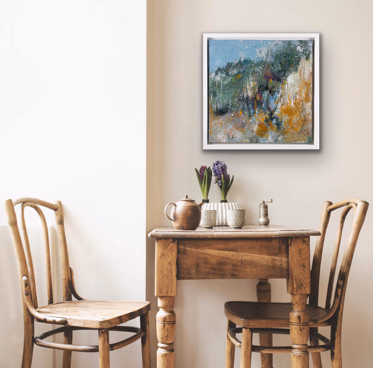 “Mountains high and valleys low” is part of a series of paintings inspired the notion of significance, special places, people, moments, and times that remind me of what is real and important in my life. This abstract landscape is created full of layers of texture, depth and colour, reflecting the diverse and abundant life found in the beautiful mountains of the Western Cape. Time spent in nature can change us in unexpected ways, providing moments of connection, of finding peace, moments of gratitude and awe, of just being. As I paint there is a constant dance as I work up close on the detail and then step away, over and over again, to get multiple perspectives; in the same way when looking at the painting as a whole one is drawn into the detail, the layers, the texture, the colours, and then back to the whole, or on to a different area with its own unique layers, colours, shades and depth.