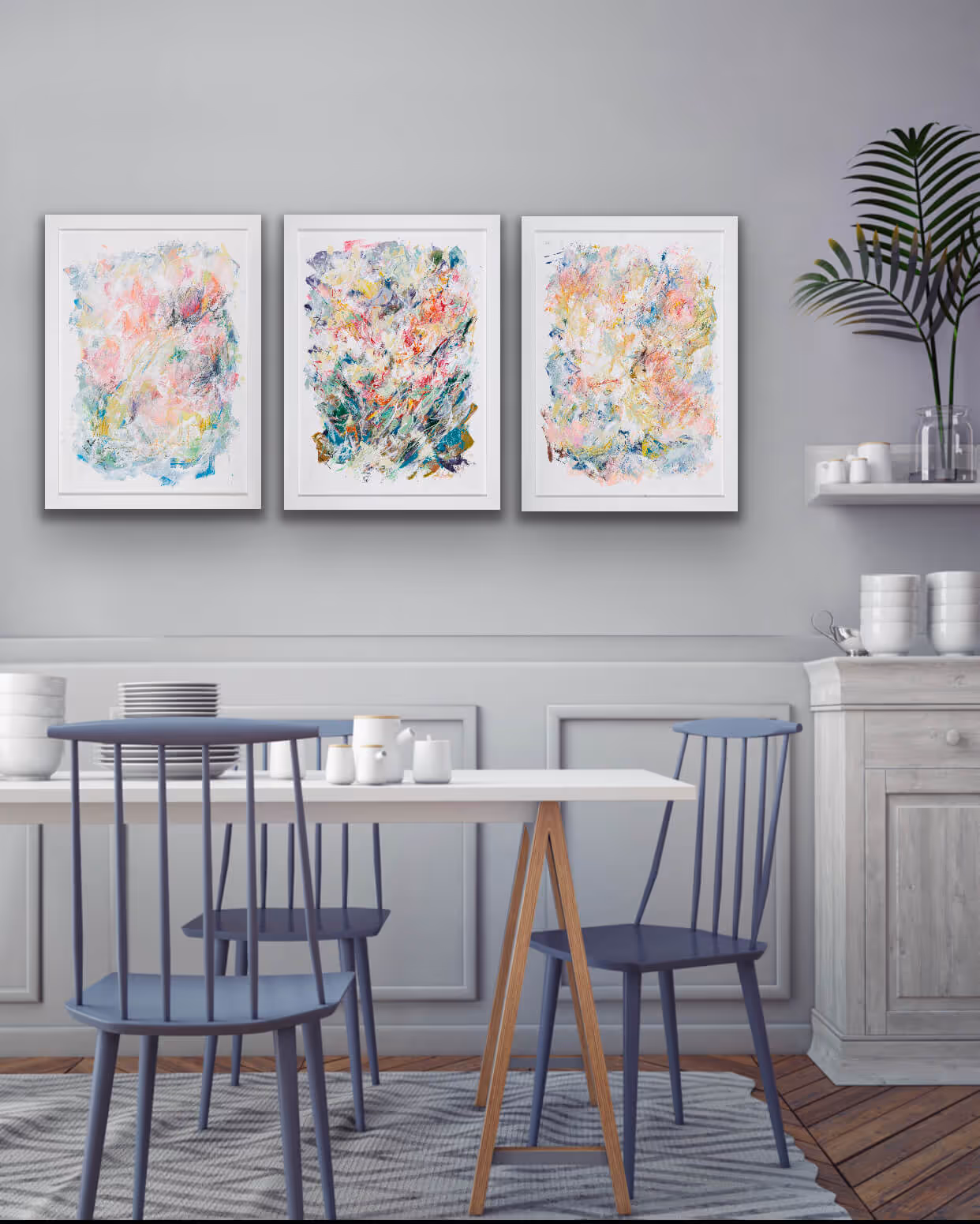 Part of a series created with a renewed appreciation for places that remind me of what is important, what is real, lasting and authentic. This painting is inspired by a morning spent walking through my friend’s rose garden with her on a hot summer’s day. The smells, sounds, colours and shimmering heat flooded my senses and left me with a sense of wellbeing and an appreciation for the beautiful abundance of nature and the blessing of friendship and connection. Sensory overload, the joy of the moment and the memory, the smells and sounds, the peace and the harmony are all explored in this painting through colour, brushstrokes, texture and mark making.